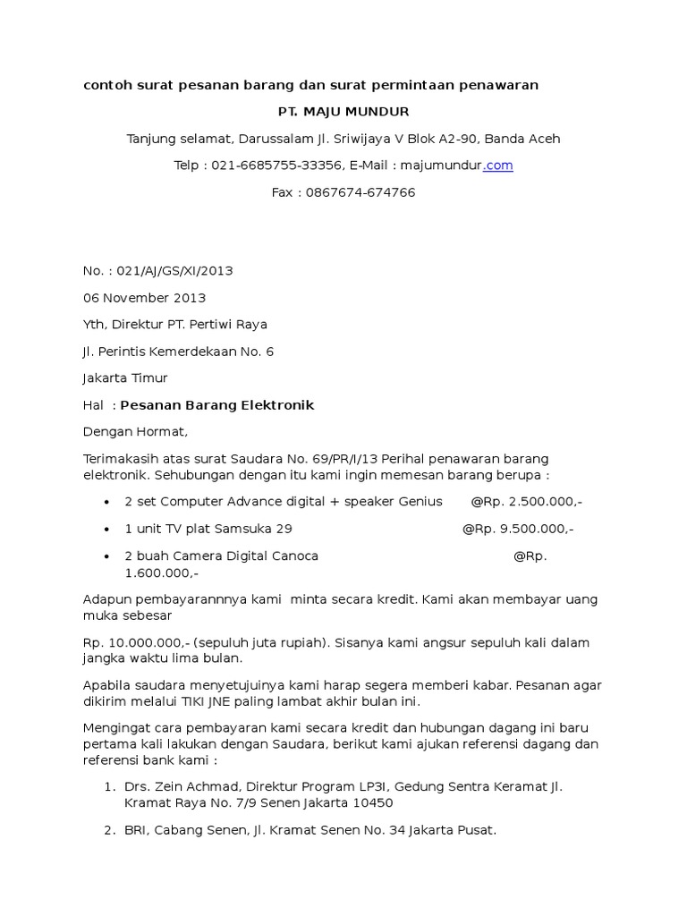 Contoh Surat Pesanan Barang Elektronik En5k0o1jgpno from idoc.pub Check spelling or type a new query. We did not find results for: Maybe you would like to learn more about one of these? Order contoh surat pemesanan barang.